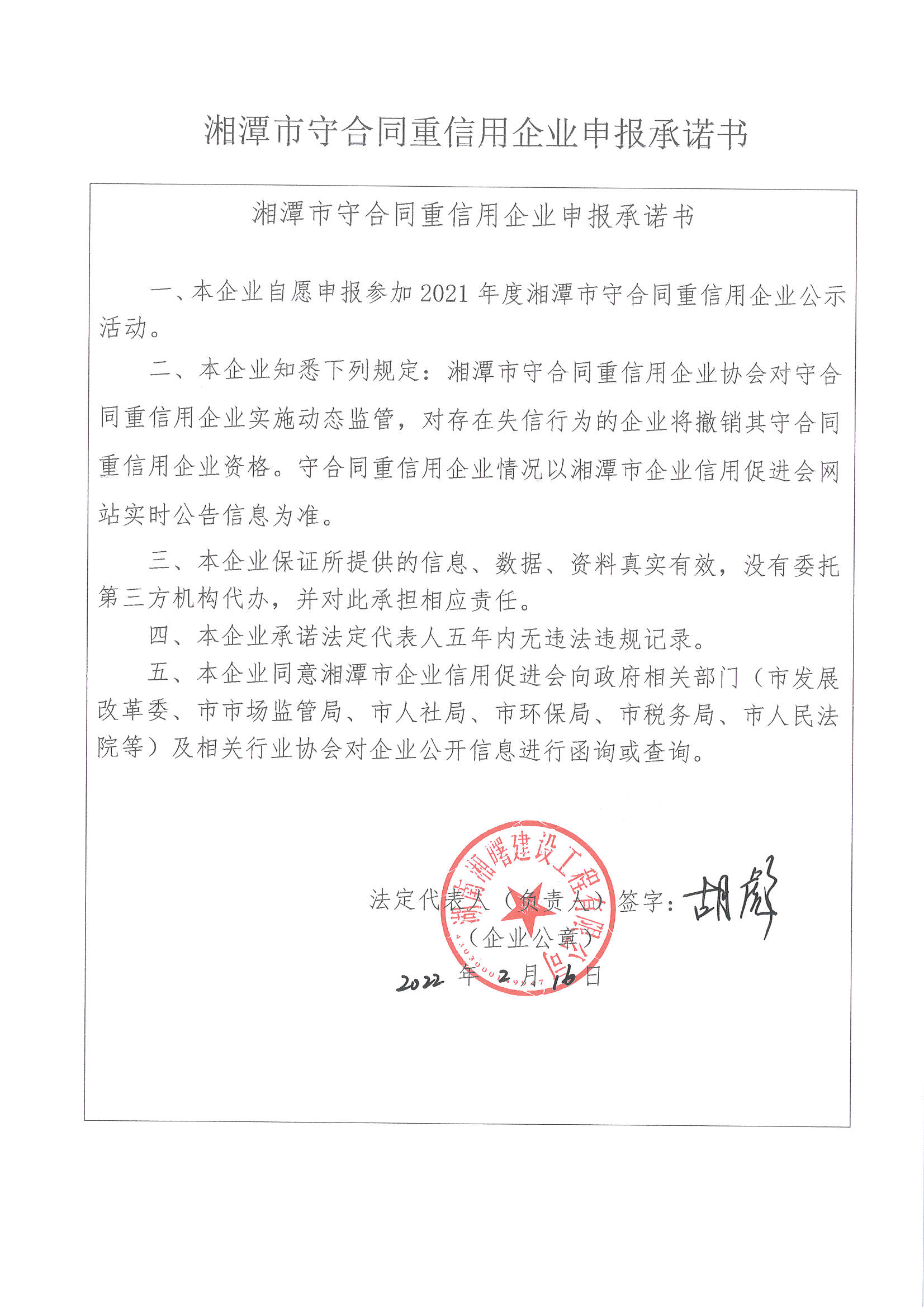 本企業根據《湘潭市守合同重信用企業申報規定》等編制 2021 年度企業信用報告書,并保證本報告書內容真實、準確、完整。