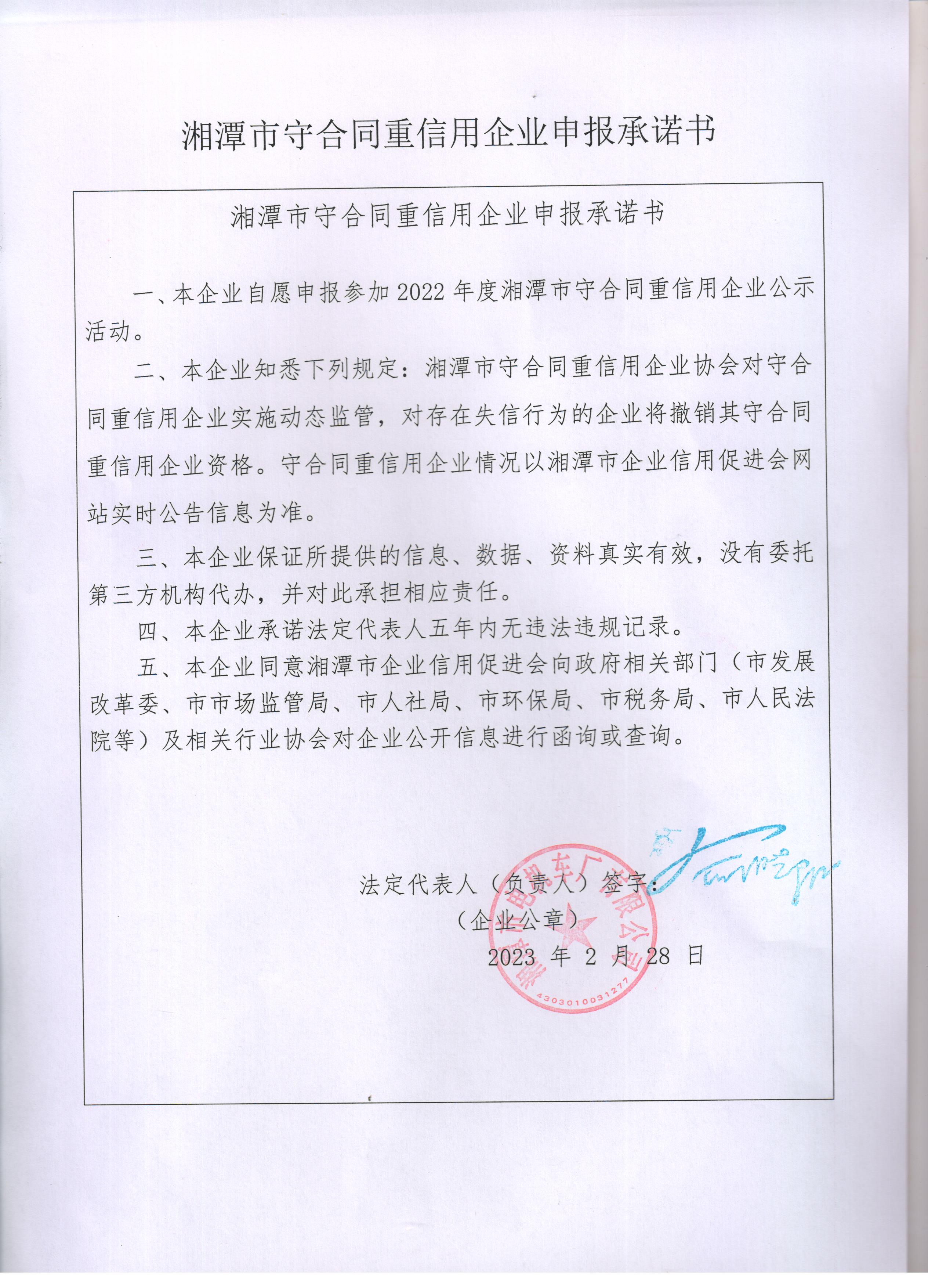 本企業(yè)根據(jù)《湘潭市守合同重信用企業(yè)申報規(guī)定》等編制 2022 年度企業(yè)信用報告書,并保證本報告書內(nèi)容真實(shí)、準(zhǔn)確、完整。