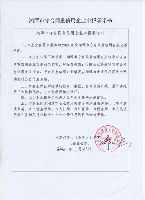 本企業(yè)根據(jù)《湘潭市守合同重信用企業(yè)申報規(guī)定》等編制 2021 年度企業(yè)信用報告書,并保證本報告書內(nèi)容真實、準確、完整。