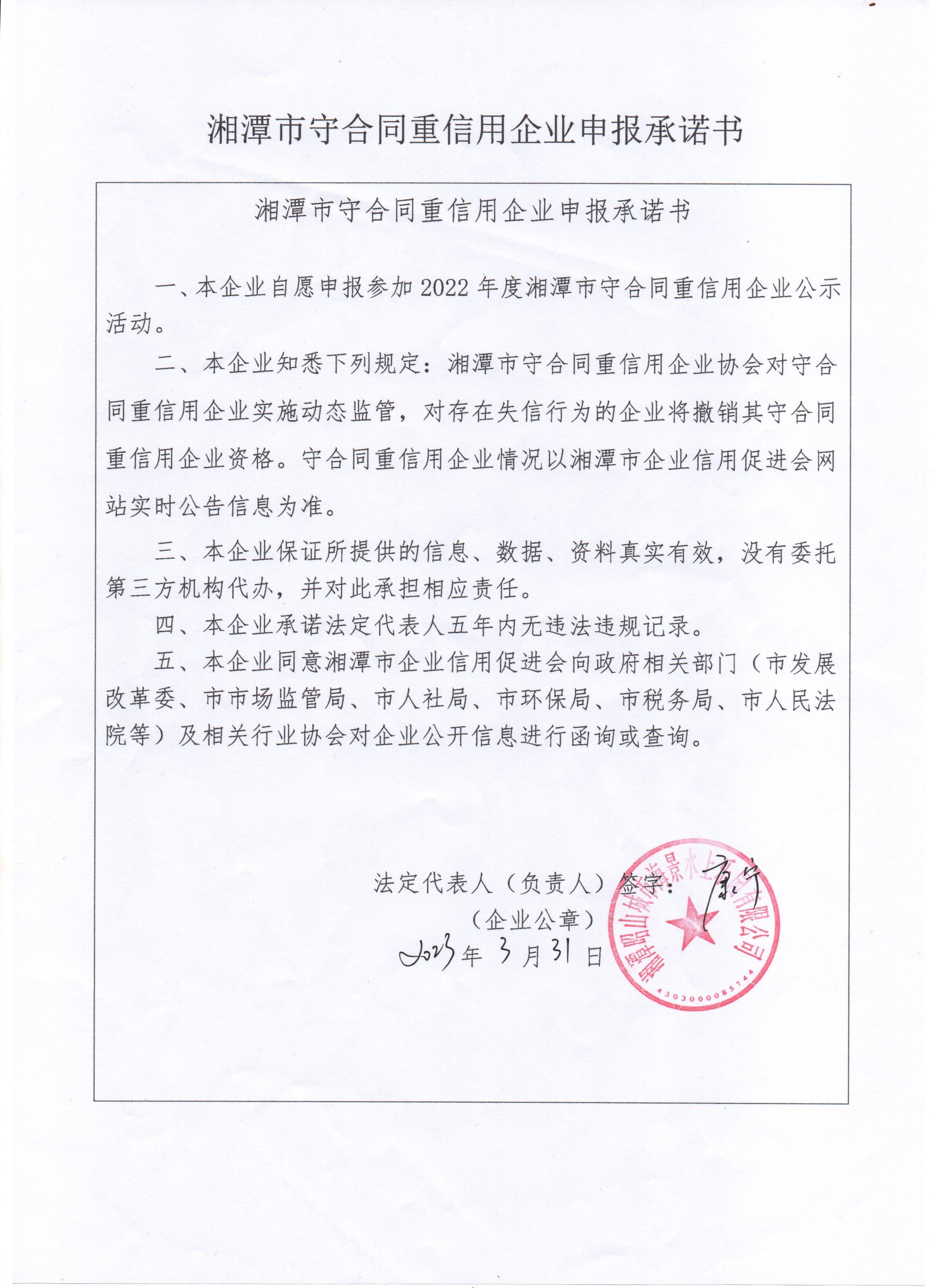 本企業(yè)根據(jù)《湘潭市守合同重信用企業(yè)申報(bào)規(guī)定》等編制 2022 年度企業(yè)信用報(bào)告書(shū),并保證本報(bào)告書(shū)內(nèi)容真實(shí)、準(zhǔn)確、完整。