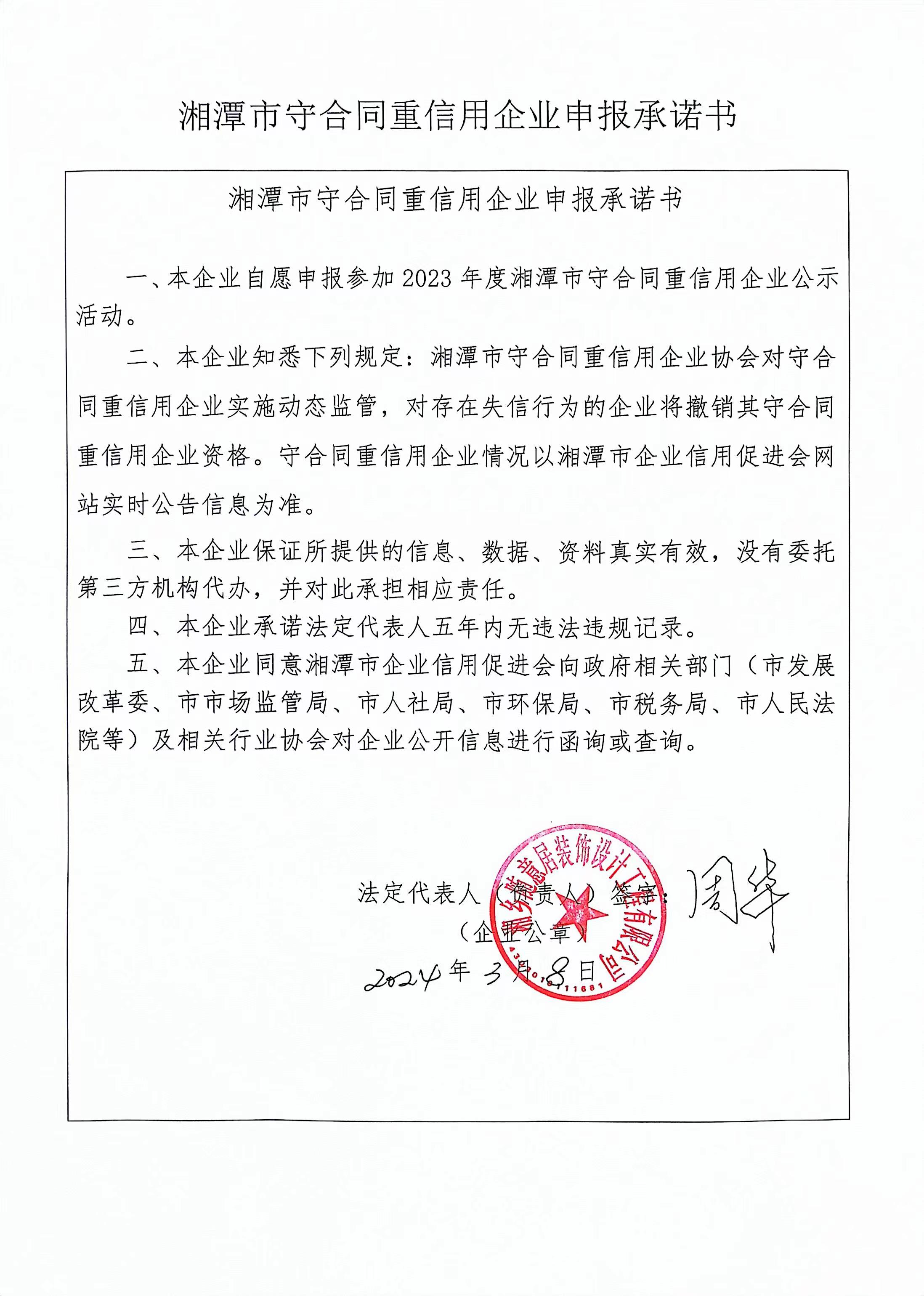 本企業根據《湘潭市守合同重信用企業申報規定》等編制 2023 年度企業信用報告書,并保證本報告書內容真實、準確、完整。